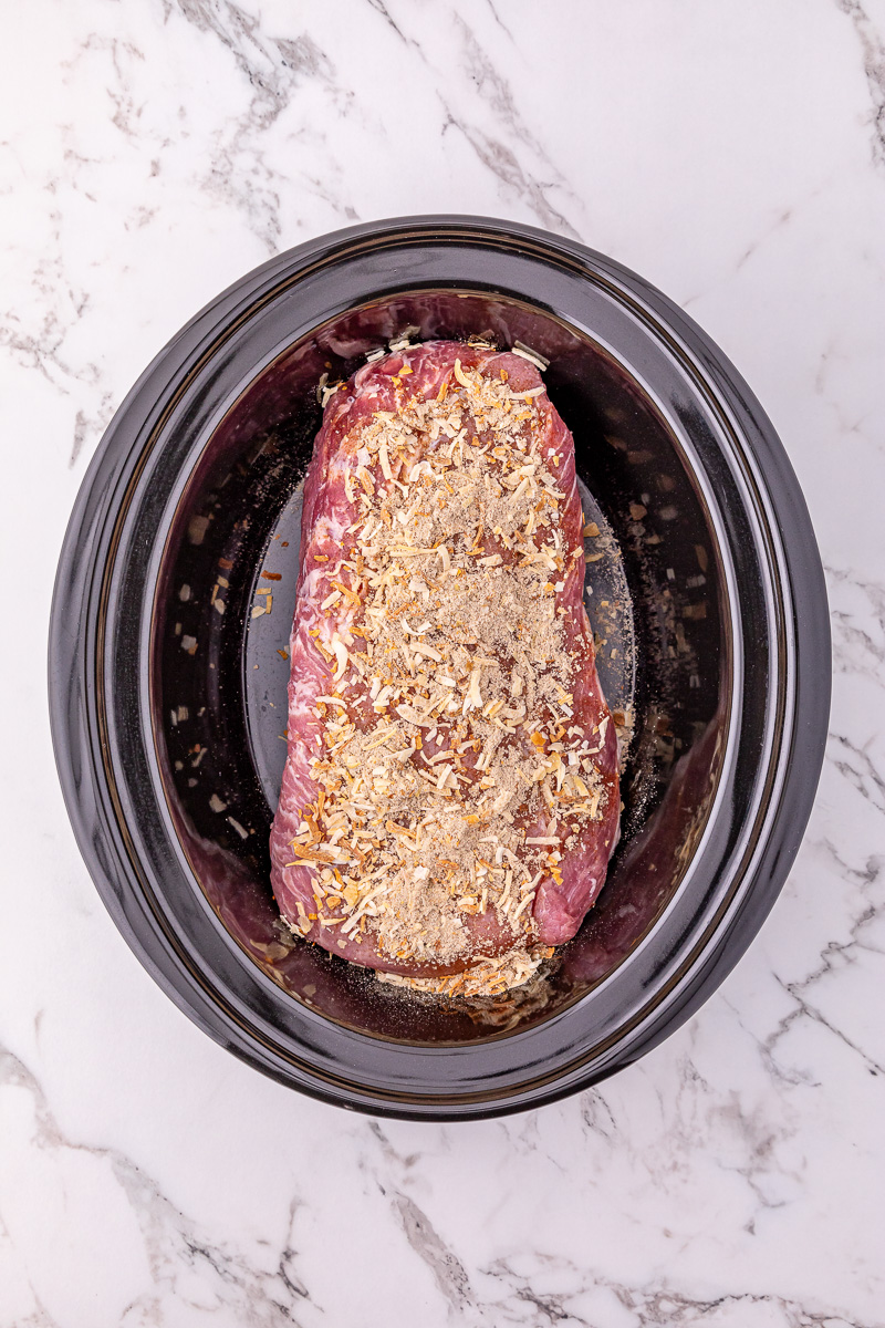 STEP ONE – Place pork loin into the crockpot and top with dry onion soup mix.