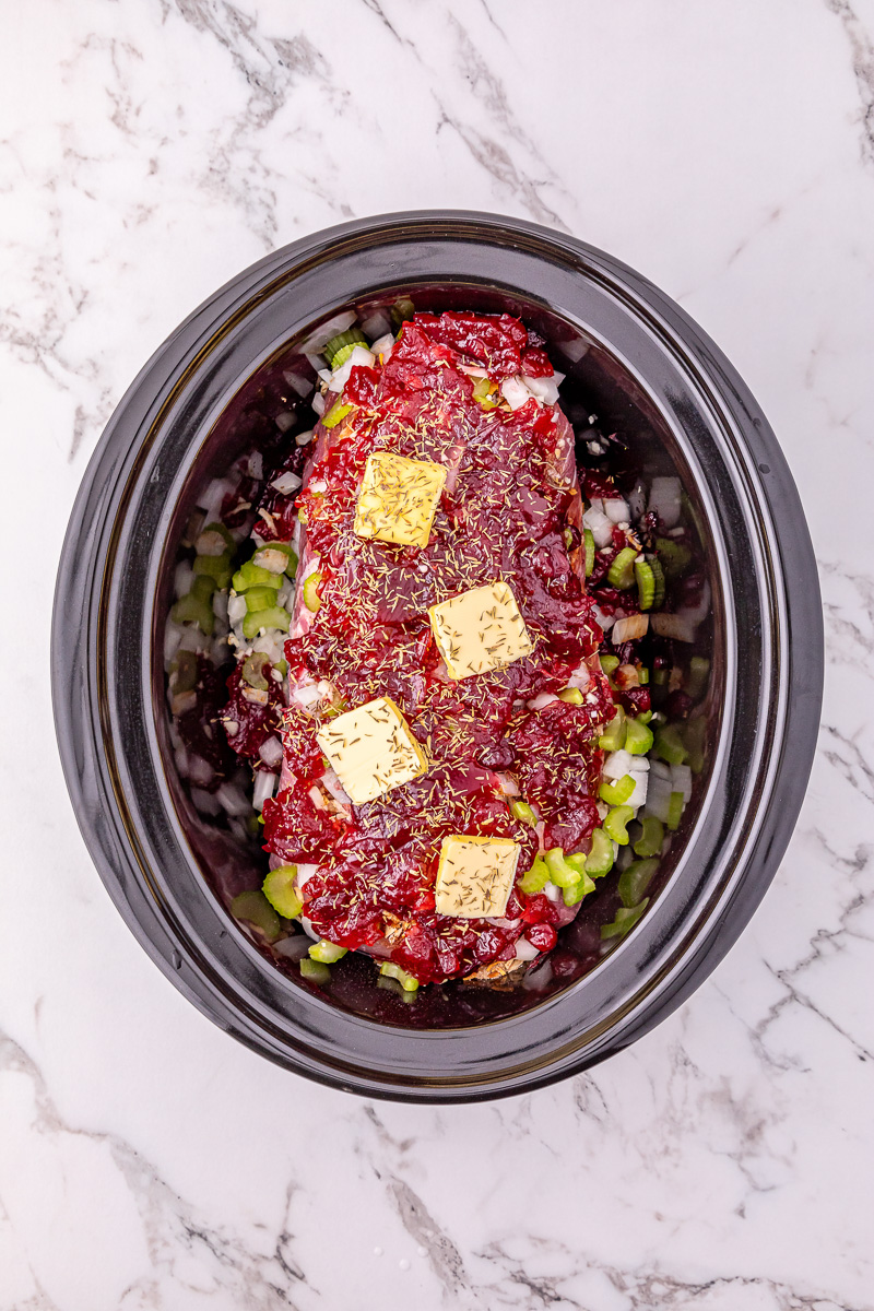STEP THREE – Top with cranberry sauce, slices of butter, and dried thyme.