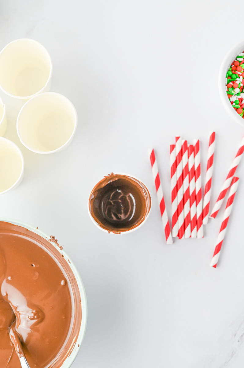 - Enjoy, or if desired, use any remaining melted chocolate (almond bark can be re-melted), to drizzle over the front of the cups. Sprinkle with more sprinkles.