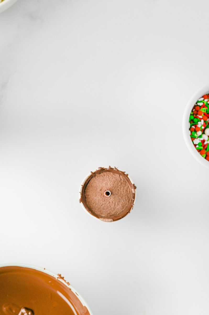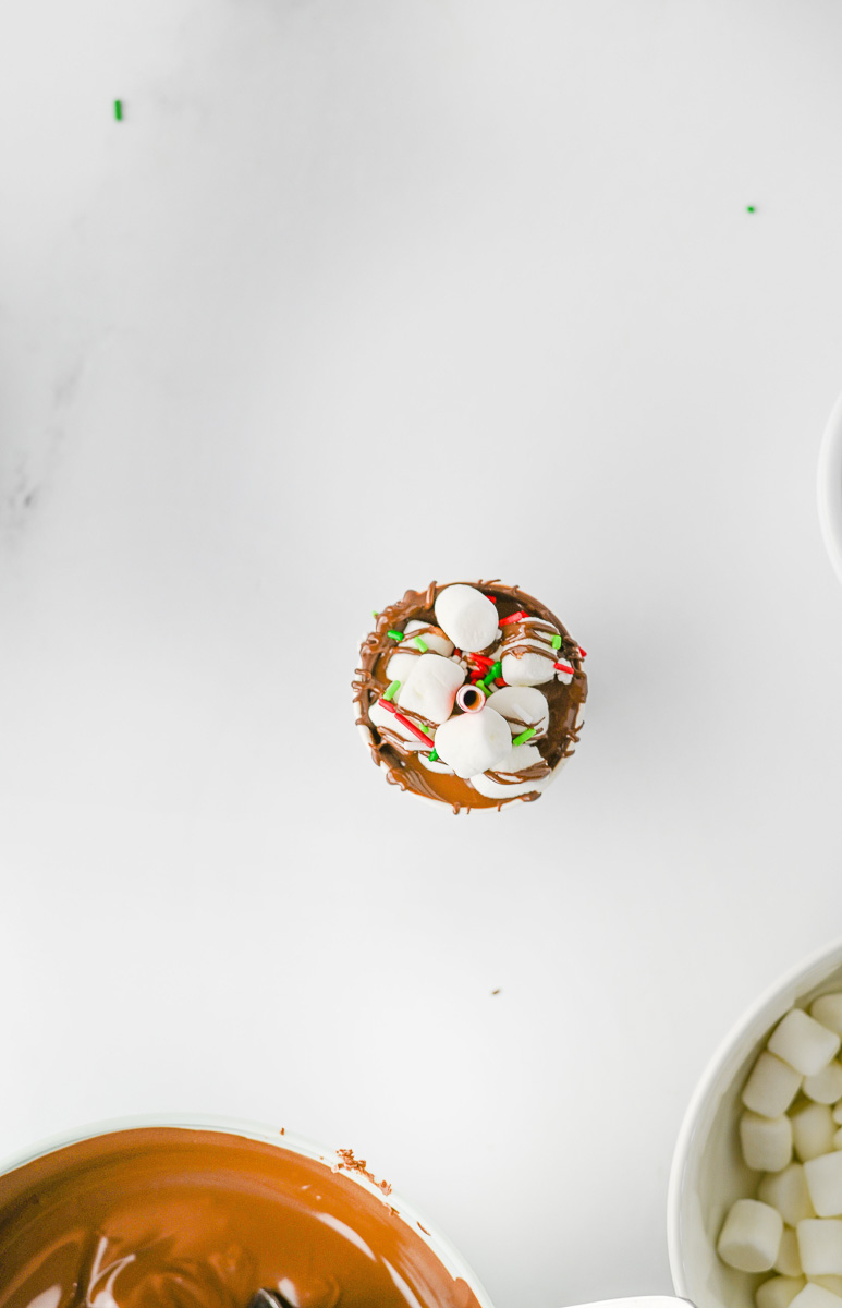 - Spoon a bit more chocolate into the top of the cups over the hot chocolate mix.ย Press some mini marshmallows into the chocolate on top.ย Use a fork to drizzle some chocolate over the marshmallows.ย Add a few more marshmallows, and sprinkle with sprinkles.