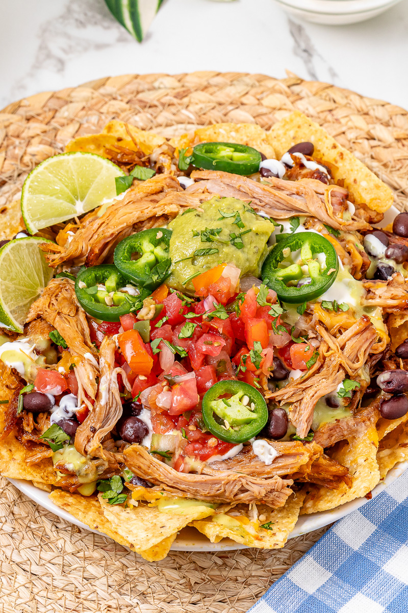 These pulled pork nachos are the ultimate game day food. Crispy tortilla chips are piled high with tender pulled pork, melty cheese, and all your favorite toppings for an easy, shareable appetizer thatโs perfect for football parties. Whether youโre hosting a crowd or watching the game at home, these nachos are always a hit.