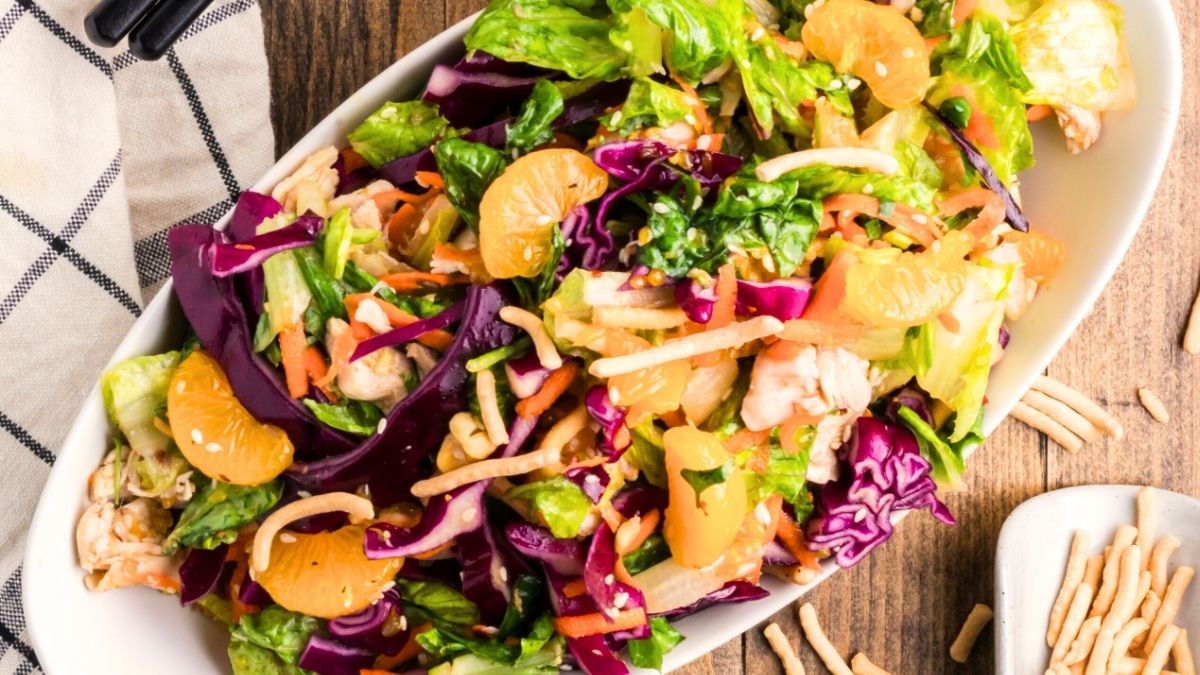 This Easy Chinese Chicken Salad comes together in just 15 minutes, making it the perfect summer dinner salad for a hot day. Packed with bold Asian flavors like soy sauce, ginger, and toasted sesame oil, it’s full of fresh crunch from red cabbage and chow mein noodles, plus a sweet touch of mandarin oranges. Get the Recipe: Chinese Chicken Salad